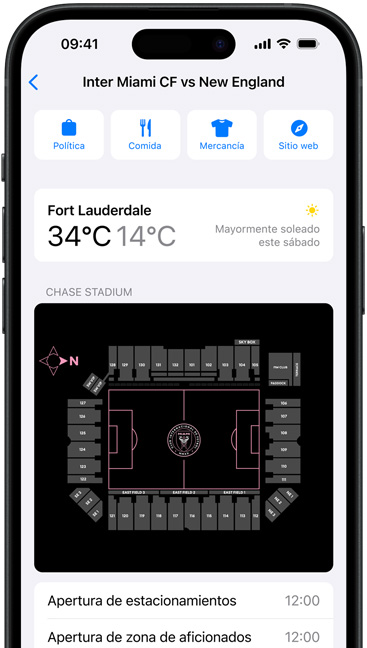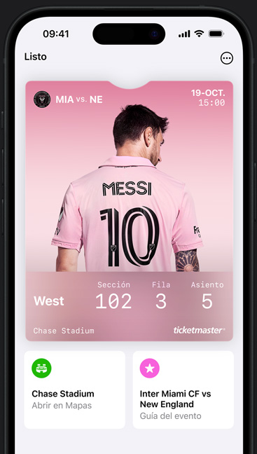 • Usar diferentes tipos de tarjetas y pases en Apple Wallet es muy sencillo. Algunos pases pueden aparecer automáticamente según la hora y ubicación, como una tarjeta de embarque cuando llegas al aeropuerto.