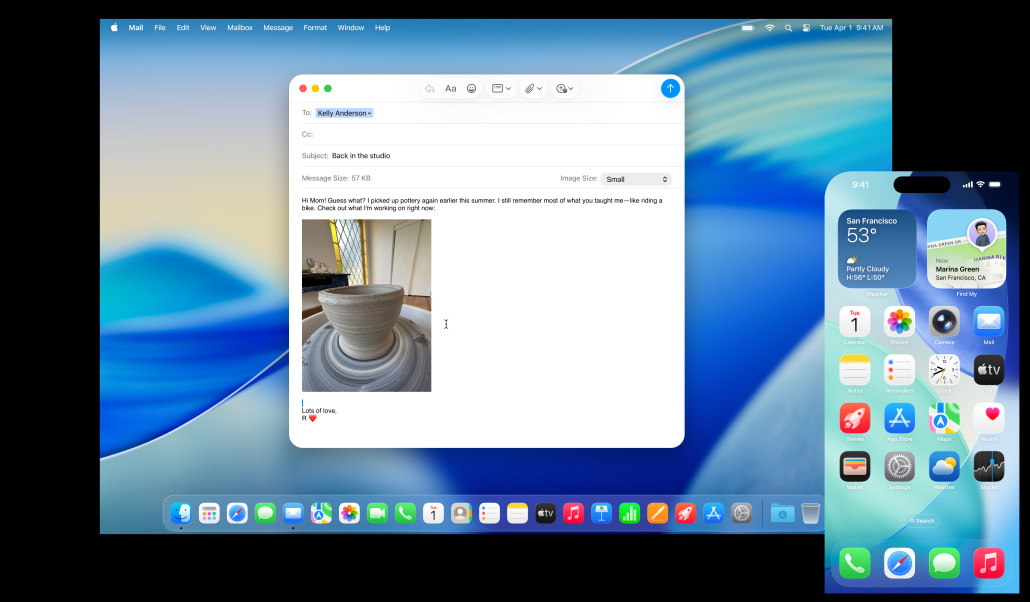 Mac, iPhone, iPad, dan Apple Watch luar biasa saat bekerja sendiri. Dan semakin mengagumkan saat digunakan bersama. Berkat Kontinuitas, perangkat Anda bekerja sama dengan mulus — memungkinkan berbagai fitur yang andal. Mulai email di Mac dan selesaikan di iPad Anda. Ambil foto di iPhone dan lihat foto itu muncul di Mac Anda. Atau lakukan panggilan tanpa menyentuh iPhone Anda.1 Nikmati keajaiban Kontinuitas.