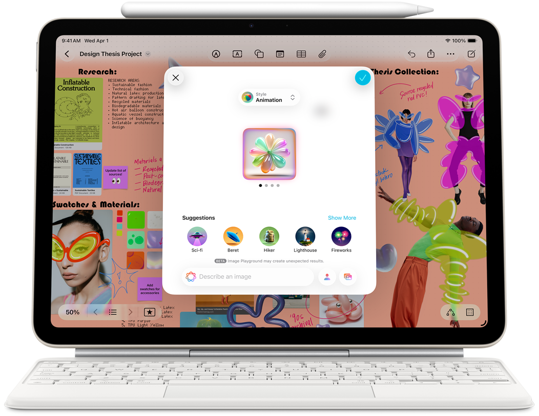 Landscape view of iPad Air showcasing Apple Intelligence with Image Playground, and Keynote, Apple Pencil Pro