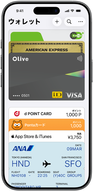 クレジットカードなどのカードを追加するには、ウォレットアプリを開いて「+」マークをタップし、対応するカードをiPhoneの背面にかざすだけです1。カードを手動で追加する場合は、ウォレットアプリを開いて「+」マークをタップし、画面上の手順に従ってください。銀行やカード会社による認証が行われます。Apple Watchをペアリングしている場合は、Apple Watchにカードを追加するかどうかも選べます。新しいiPhoneにアップグレードする時も、ワンステップで簡単にカードを移行できます。