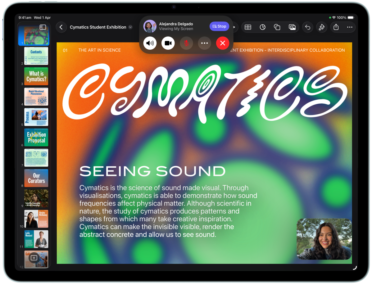 iPad Air, front exterior, user is on FaceTime and looking at Keynote in front of another iPad Air, back exterior