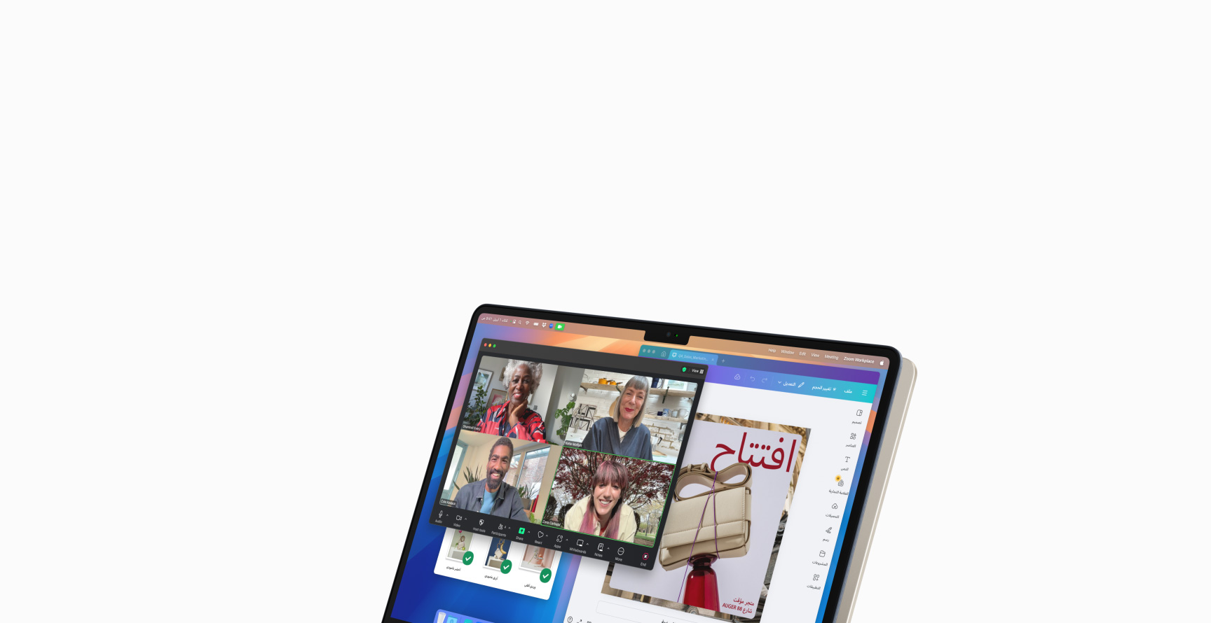جهاز MacBook Air مقاس 13 إنش وجهاز MacBook Air مقاس 15 إنش مفتوحان جزئياً، وتعرض شاشة الجهاز الأول مشروع تصميم قيد التنفيذ، في حين أن شاشة الجهاز الآخر تعرض مثلاً عن إنجاز مهام متعددة باستخدام الإيميل وجداول بيانات