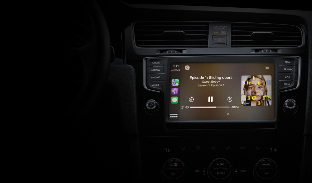 CarPlay lets you listen seamlessly from your iPhone in your car, bringing the same in‑depth experience to your vehicle’s built‑in controls.2 You can even ask Siri to play the latest episode or control playback. And Apple Podcasts comes pre-installed in selected car models.